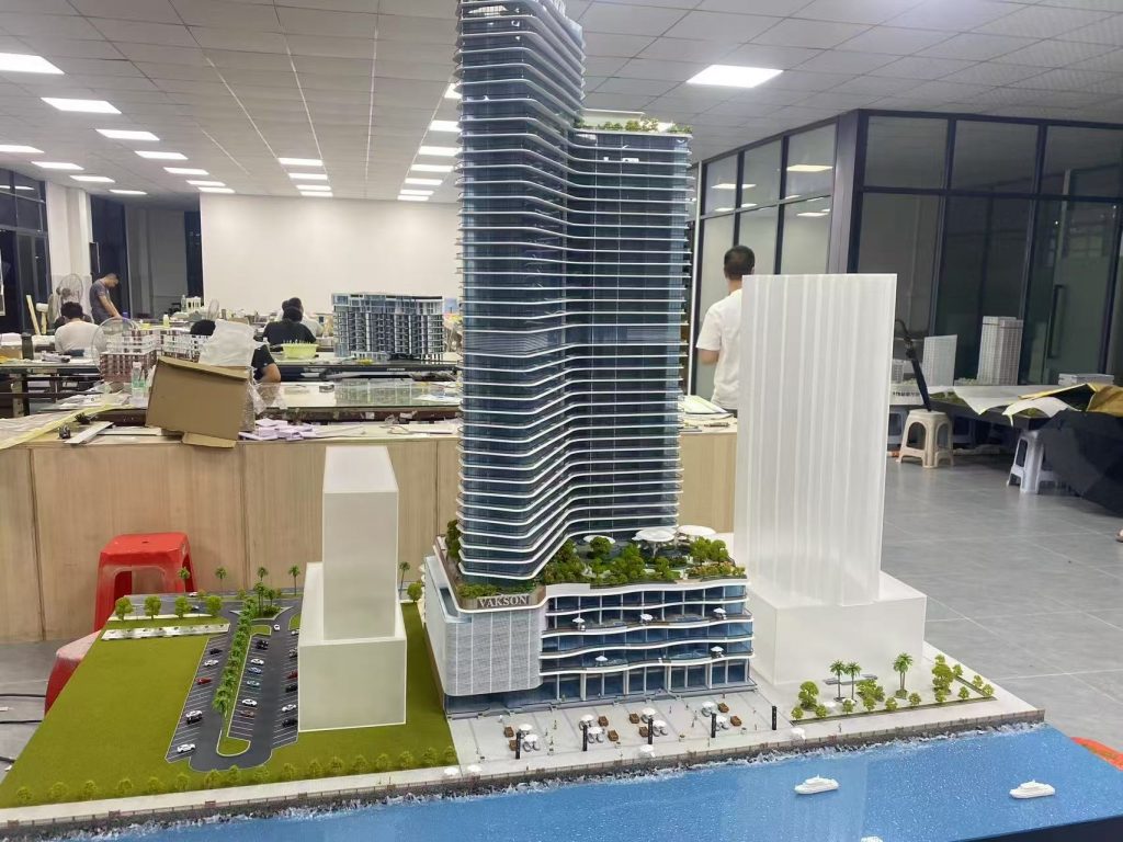 The is an architectural model of a high-rise building complex. The model includes a tall, modern skyscraper with layered balconies, a smaller building with the name “VAKSON” on it, and another simpler, white rectangular structure. The model also features landscaping details like palm trees, other greenery, parking areas with miniature cars, and a waterfront with small boats. The background suggests the model is in an office or workshop setting, with desks, lights, and people working in the background.
