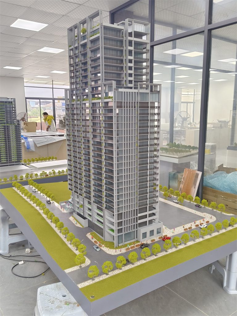 This is a detailed architectural model of a tall modern building. The model includes the building itself with numerous floors, balconies, and a grey facade. It is surrounded by miniature landscaping with trees, roads, and even tiny cars and figures to give it a sense of scale and context. The model sits on a larger platform and appears to be in an office or workshop setting