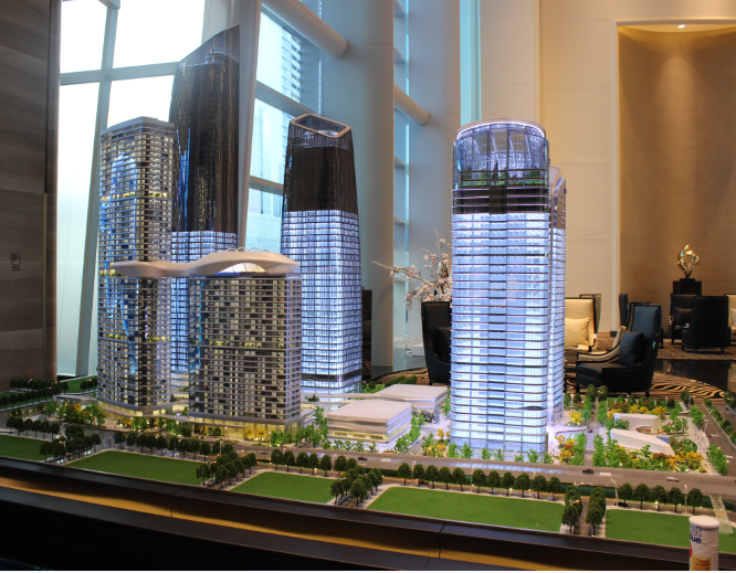 The is an architectural model of a complex of modern skyscrapers and surrounding landscape. The model is highly detailed, with illuminated towers and miniature trees. The backdrop suggests it is displayed within a large, well-lit space.