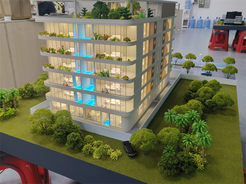 The image shows a scale model of a modern luxury apartment building called “Imperial Residence.” It features multiple floors with large windows and balconies, some of which have small pools. The model also includes landscaping, miniature figures of people, a car, and a street. In the background, a larger building is visible, possibly intended to represent a skyscraper or landmark.