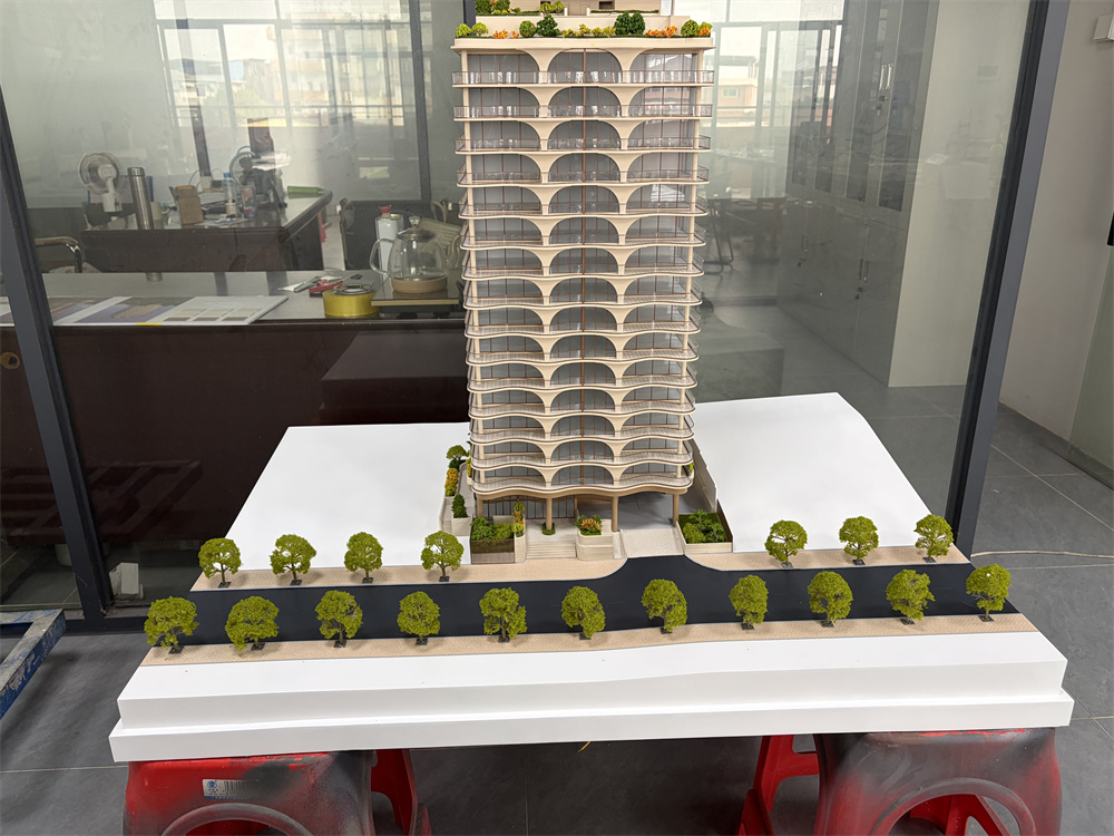 The is an architectural model of a high-rise building. The model is placed on a white platform,There’s a line of small, artificial trees in front of the building model. The building itself features a modern design with repeating arched elements and a rooftop garden. In the background, visible through glass, is an office space with various items on a desk.