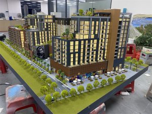 Exterior building model with full details ,color , landscape , car parking ect, 3D priting with full colors for buildings.Main material using high quality Acrylic &abs sheet varied type 0.5 mm and 1mm acrylic.Luxiliary materials: tree, grass, and all green part is made by for each order.
