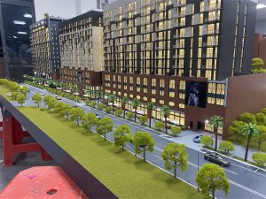 Exterior building model with full details ,color , landscape , car parking ect, 3D priting with full colors for buildings.Main material using high quality Acrylic &abs sheet varied type 0.5 mm and 1mm acrylic.Luxiliary materials: tree, grass, and all green part is made by for each order.